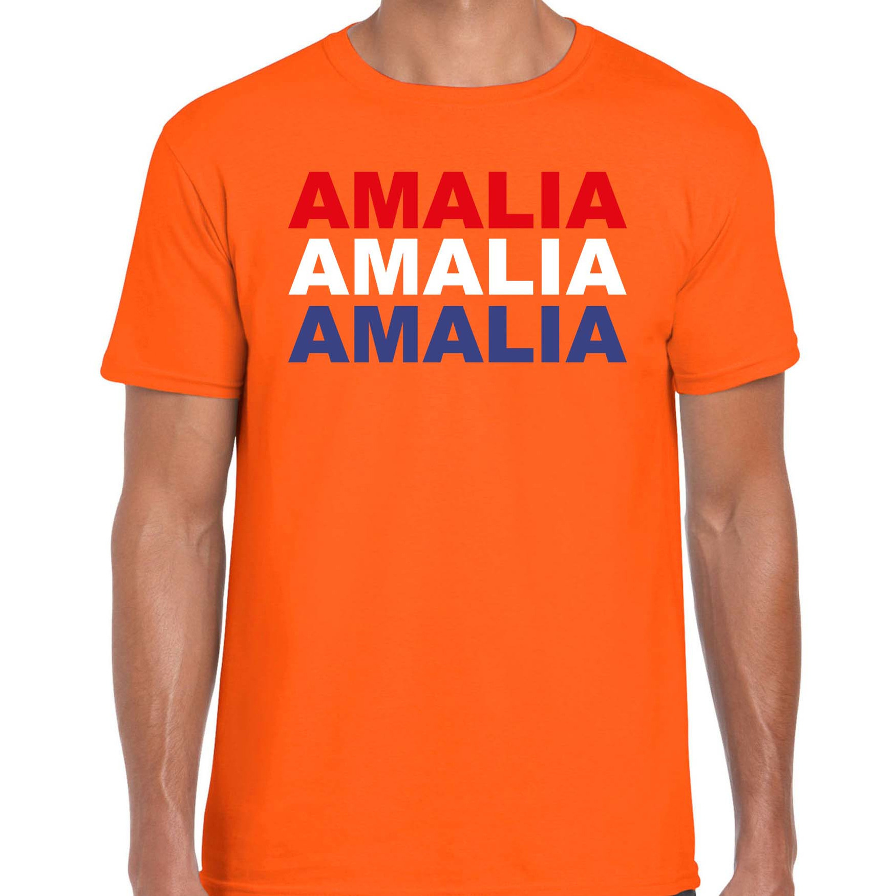 Amalia Koningsdag t-shirt oranje voor heren. Dit oranje shirt is bedrukt met de tekst: Amalia. Verwerkt als een Nederlandse vlag. Leuk shirt om aan te trekken als outfit / kleding naar een Koningsdagfestival, op de Koningsdagmarkt of op een andere happening tijdens Koningsdag.